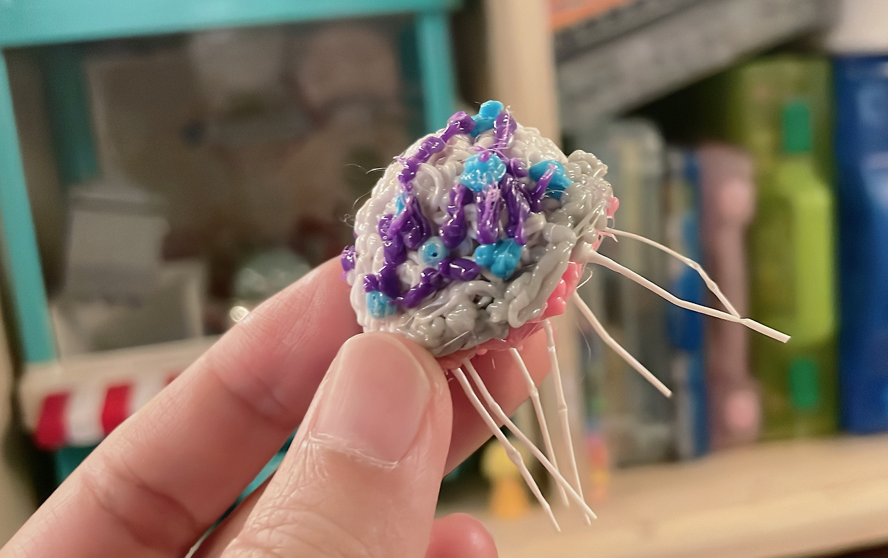 처음엔 납작이 해파리를 만들고 맘에 안 든다고 퉁퉁거리길래 “와~ 북마커 하면 되겠다.!”하고 꼬셔서 기분을 좀 풀어줬더니 2번째 작품은 입체로 만들어 보겠다고 고사리 같은 손을 움직입니다. 사나고 아저씨가 작업하는 걸 몇 번 봤다고 장갑 낀 손가락으로 필라멘트를 잡아가며 집중!