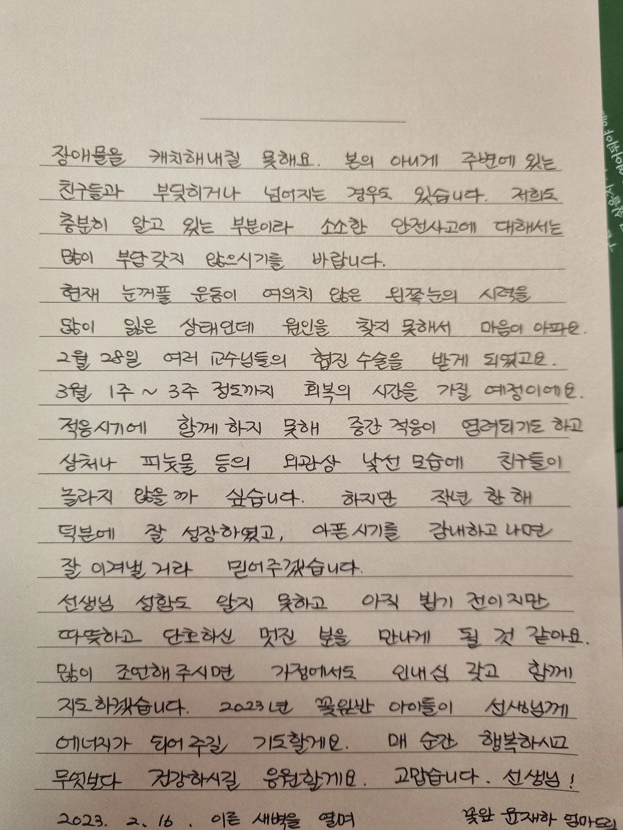 (나도 성인군자는 아니지 않나. 수술을 마치고 나면 낯선 선생님과 낯선 친구들 사이에서 아픈 눈으로 얼마나 작아질까.. 나 역시 똑같은 부모다. 걱정만 한가득한 부모마음~ 제발 따뜻한 선생님이어라! 긴장하지 않을 수 없는.)