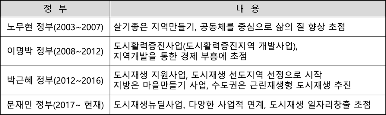 도시재생의 정책적 흐름은 노무현 정부의 ‘살기좋은 지역만들기’ 부터 현 문재인 정부의 ‘도시재생뉴딜’까지 연결된 흐름으로 봅니다.