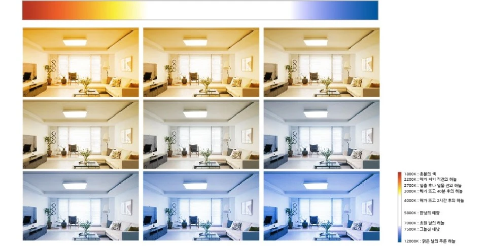 거실에서는 무드등이라하여 2200K ~ 2700K 구간의 난색 조명을 사용합니다. 오랜시간 편안한 기분을 느껴야 하는 휴식공간에서 많이 사용합니다.