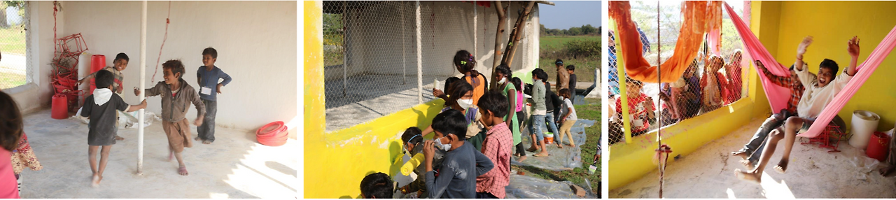 놀이터는 당시에 돈이 부족해 크게 만들거나 놀이기구들을 들일 수는 없었다. 그래서 어떻게 놀이터를 꾸미면 좋을까 하다가 어디에 매달려 놀기를 좋아하는 아이들을 보고 행잉 놀이터를 만들기로 했다. 한국에서 플라잉요가 해먹을 여러개 구입하여 가져갔다. 또 인도는 알록달록한 색이 많은지라 빠하르간지에서 색감이 좋은 여러 천을 사서 나머지 공간을 꾸몄다. 우리가 만든 두번째 공간이었다.