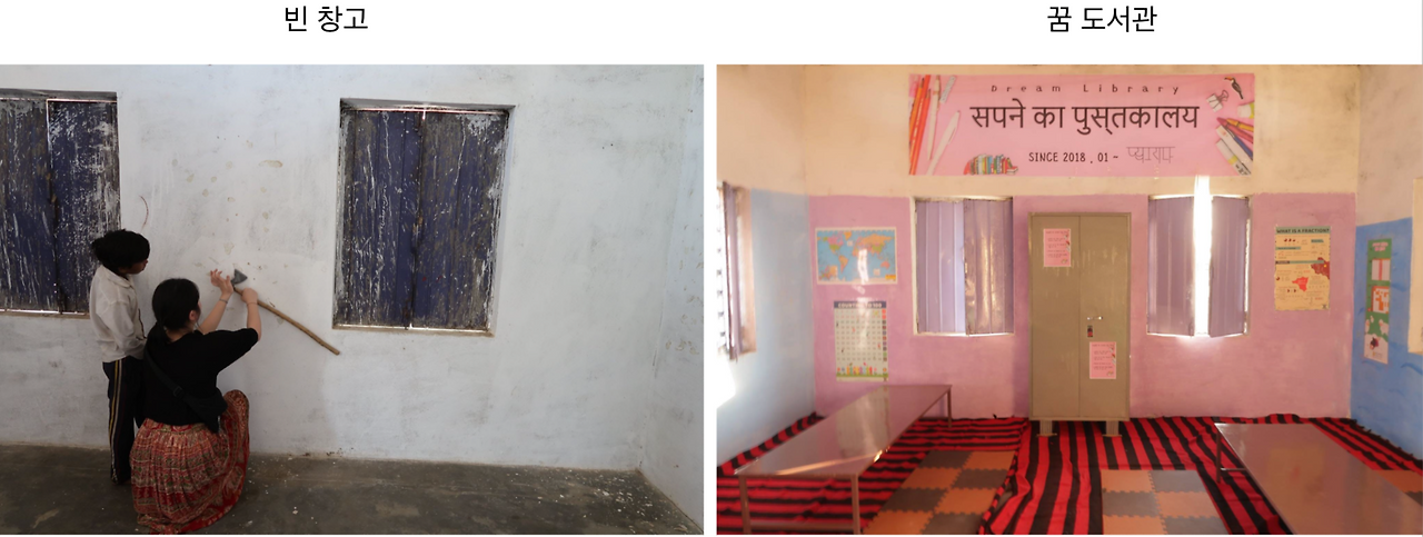 2년에 걸쳐 마을 안에 있는 빈 창고를 도서관으로, 빈 닭장을 놀이터로 바꿔놓았다. 여기저기 아무데나 박힌 못을 빼며 하루를, 더러운 벽과 바닥을 닦느라 하루를, 힌디어는 모르지만 델리에 있는 서점을 돌아다니며 동화책을 사서 책장에 채우는데 하루를, 시내주민들의 도움으로 구매한 철 책상, 카페트를 꾸미며 하루를 보냈다. 내외부벽은 아이들과 함께 페인트를 칠하기도 하고 색종이로 그림을 그려 꾸민 작품들을 붙이기도 했다. 우리가 만든 첫번째 공간이었다.