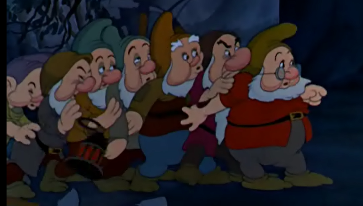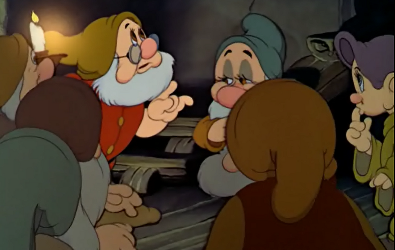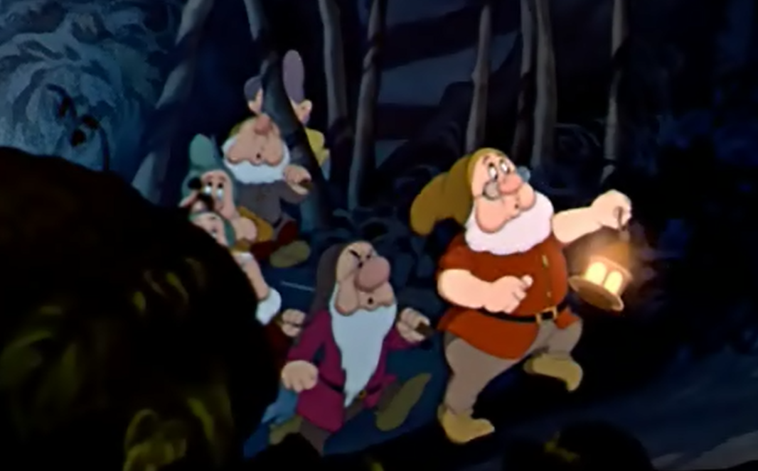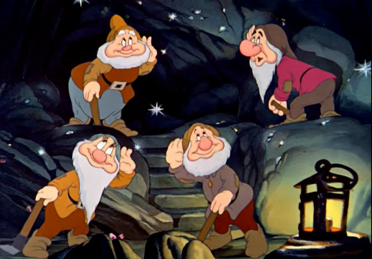영화는 장면을 전환해 일곱 난쟁이들의 세계를 보여준다. 그들은 노래하고 휘파람을 불며, 동굴 속 메아리를 듣는다.