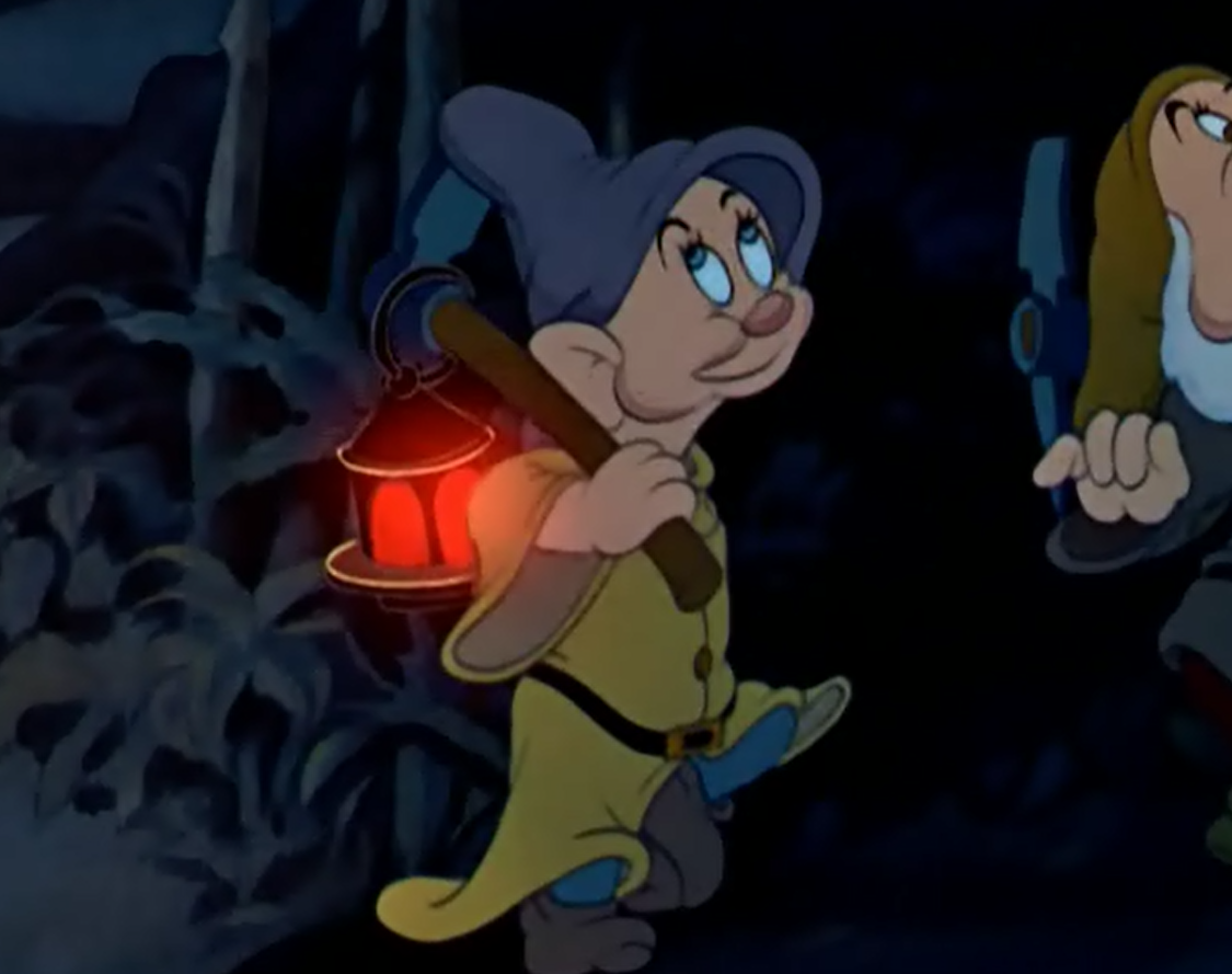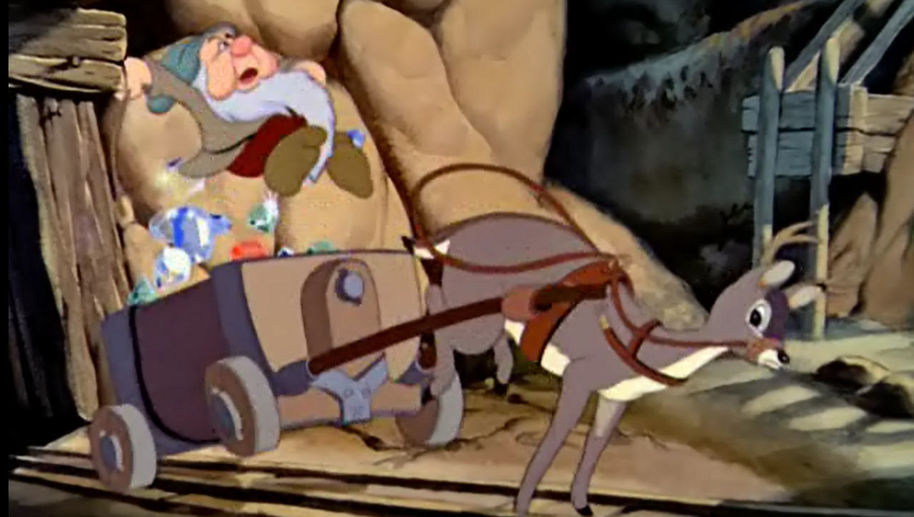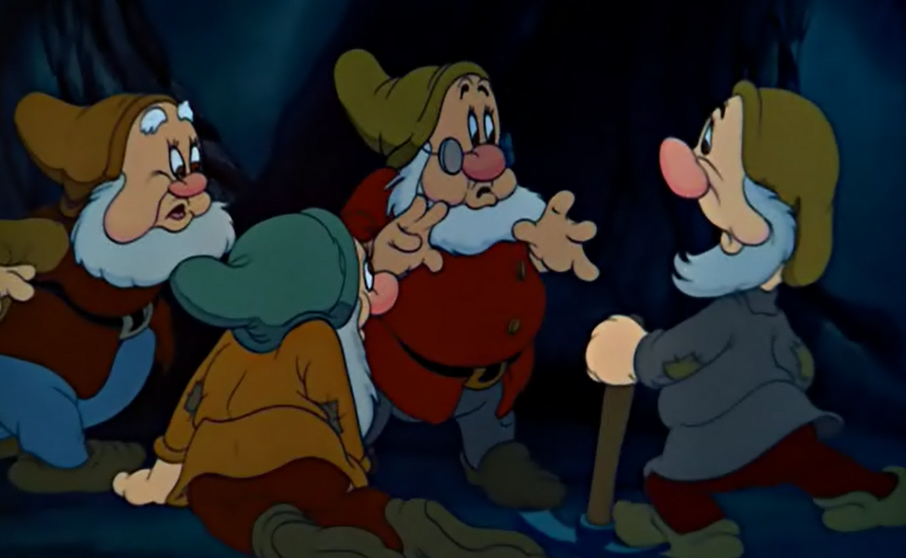 영화는 장면을 전환해 일곱 난쟁이들의 세계를 보여준다. 그들은 노래하고 휘파람을 불며, 동굴 속 메아리를 듣는다.