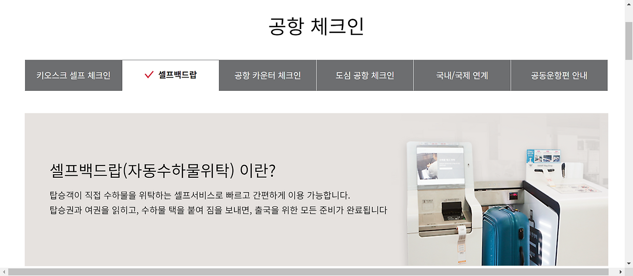 인천공항 제2 터미널은 여러 가지 시스템이 눈에 띄게 달라져 있어 확실한 현실 자각 타임을 가질 수 있었다. 6년이란 시간이 흘렀다는 것을 확실히 체감했다. 수화물 체크인도 ‘Back Drop’이라는 영문으로 표지를 붙여 놓았는데 내가 아는 의미로는 ‘배경’이란 뜻이 전부다. 공항에서 ‘배경’이라는 단어가 쓰인 곳이 수하물 자동 체크인 장소라고? 구글 번역기에도 콜린스 영어사전에도 ‘배경’ 말고 다른 의미는 나오지 않았다. 아마도 항공산업계에서 나온 신조어인 듯하다. 한국에서 영어의 파워는 내 상상을 초월한다. 언어로는 영미권의 식민지가 된 것이 분명하다. 어떻게든 외래어를 우리말로 바꿔보려는 노력이 전혀 없다는 것이 내게는 참 신기하게 느껴졌다. 효율성이 모든 가치의 우위를 점하고 있어서인지 ‘그냥 영어로 표기하면 될 것을 뭐 하러 우리말로 번역해서 귀찮게 만드는가’ 하는 생각이 기저에 깔려 있다. 이쯤 되면 국가적 차원에서의 우리말에 대한 자존감은 거의 바닥 수준이라 할 수 있다. 다음은 모 항공사의 체크인(체크인도 이젠 너무 자연스러운 외래어가 됐다) 절차 안내 페이지다. 영어로 셀프백드랍이라고 쓰고 괄호 안에 '자동수하물위탁'이라는우리말 번역을 썼다. 순서가 바뀌었어야 한다고 생각하는 내가 이상한 건지...