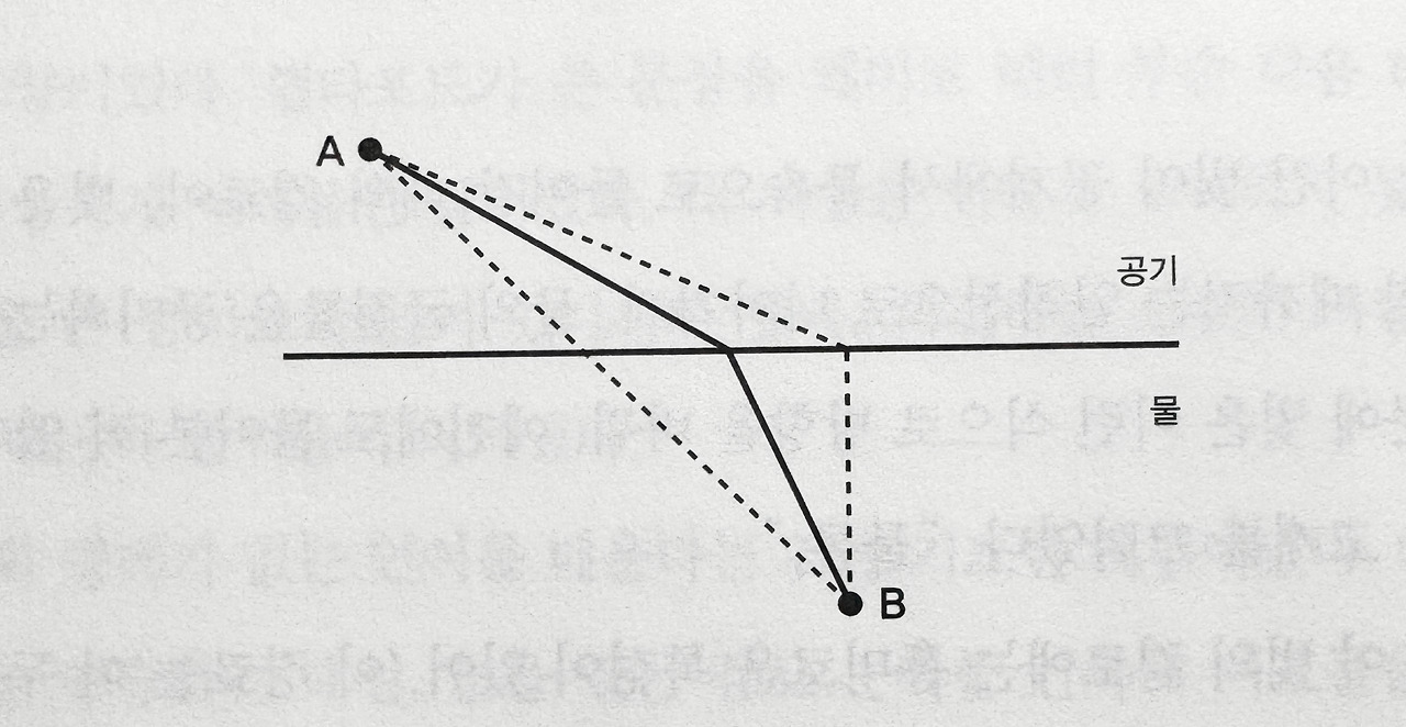 (책 속에서는 그림을 그려서 설명하고 있는데, 물속으로 투과하는 빛의 다양한 경로를 가정해 보면 빛이 직선거리로 투과할 때보다 일정 각도로 굴절될 때가 가장 최단 시간이 걸린다는 결론이 나온다. 이는 빛이 공기 중에서보다 물속에서 천천히 움직이기 때문이다.)