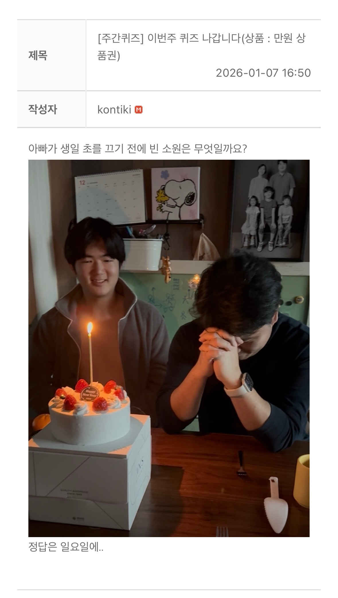 매주 퀴즈를 내는 퀴즈 게시판이 있다. 여기엔 엄마, 아빠가 번갈아가며 퀴즈를 낸다. 맞추는 사람에겐 편의점에서 쓸 수 있는 만원짜리 상품권이 주어진다. 아이들이 AI를 잘 활용하기 때문에, AI로는 절대로 풀 수 없는 퀴즈를 내기로 했다.