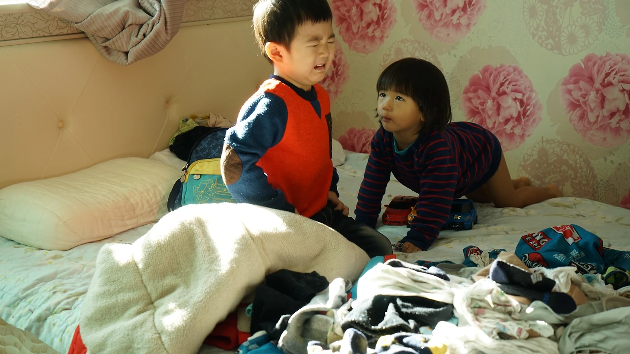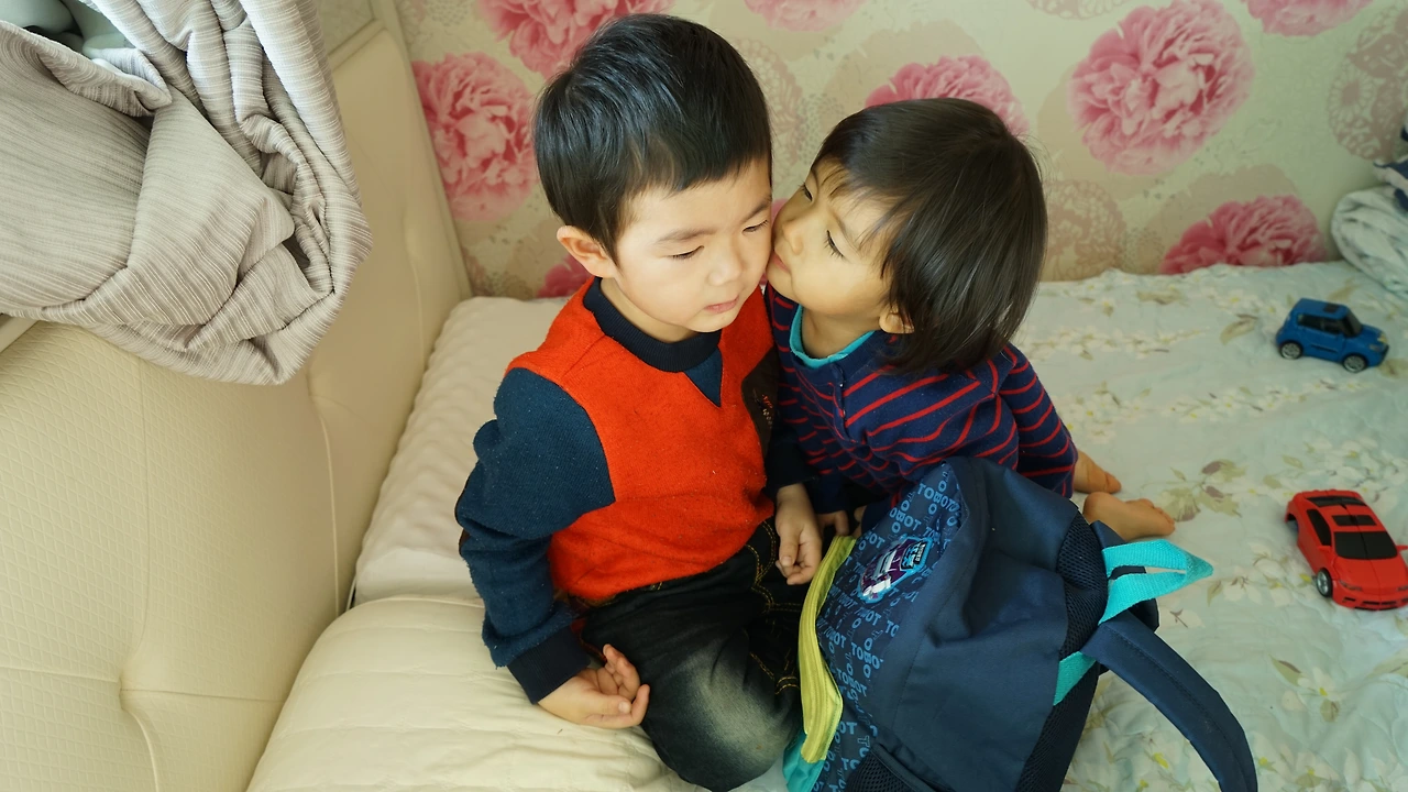 둘째가 사과의 의미로 뽀뽀하니, 첫째는 금방 웃음을 지으며 동생을 안아줬다.