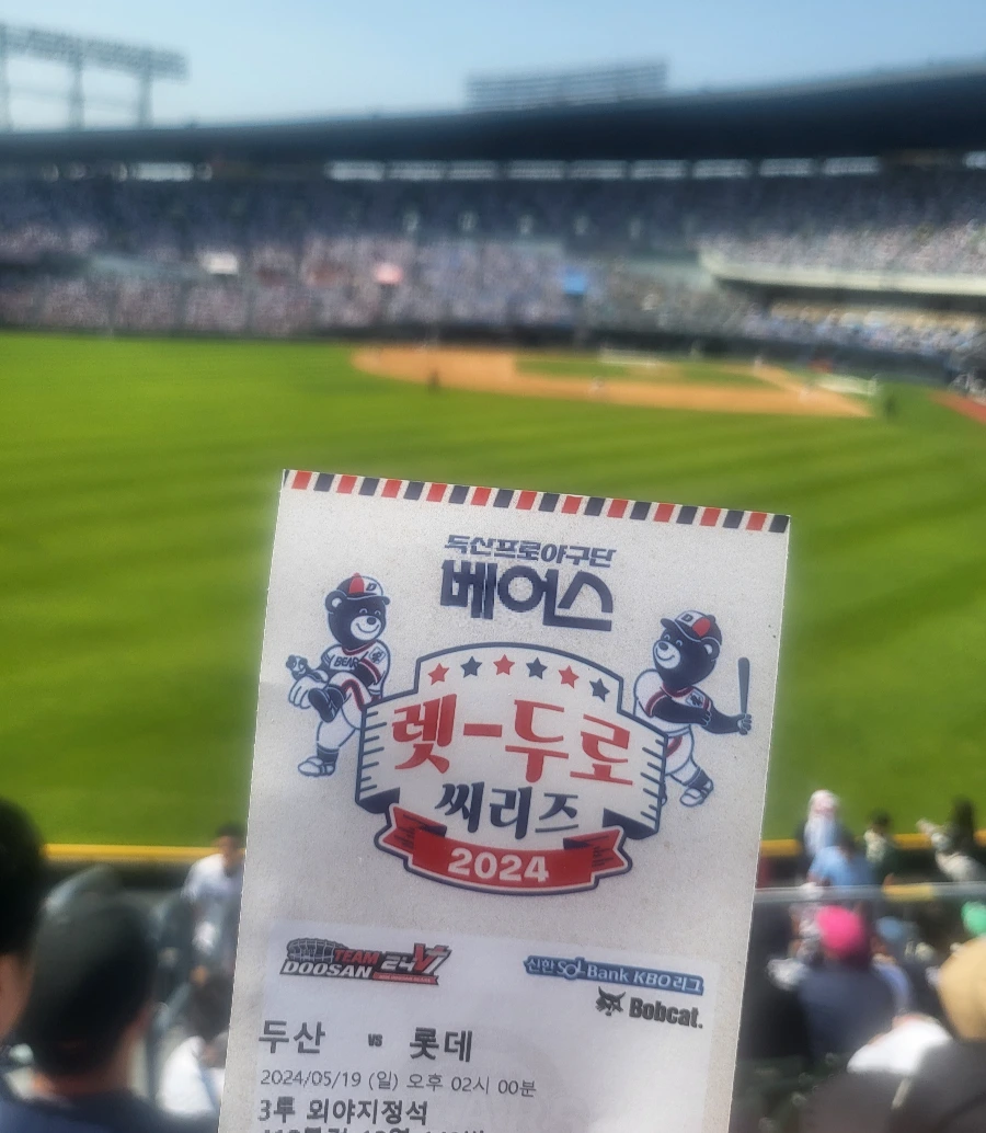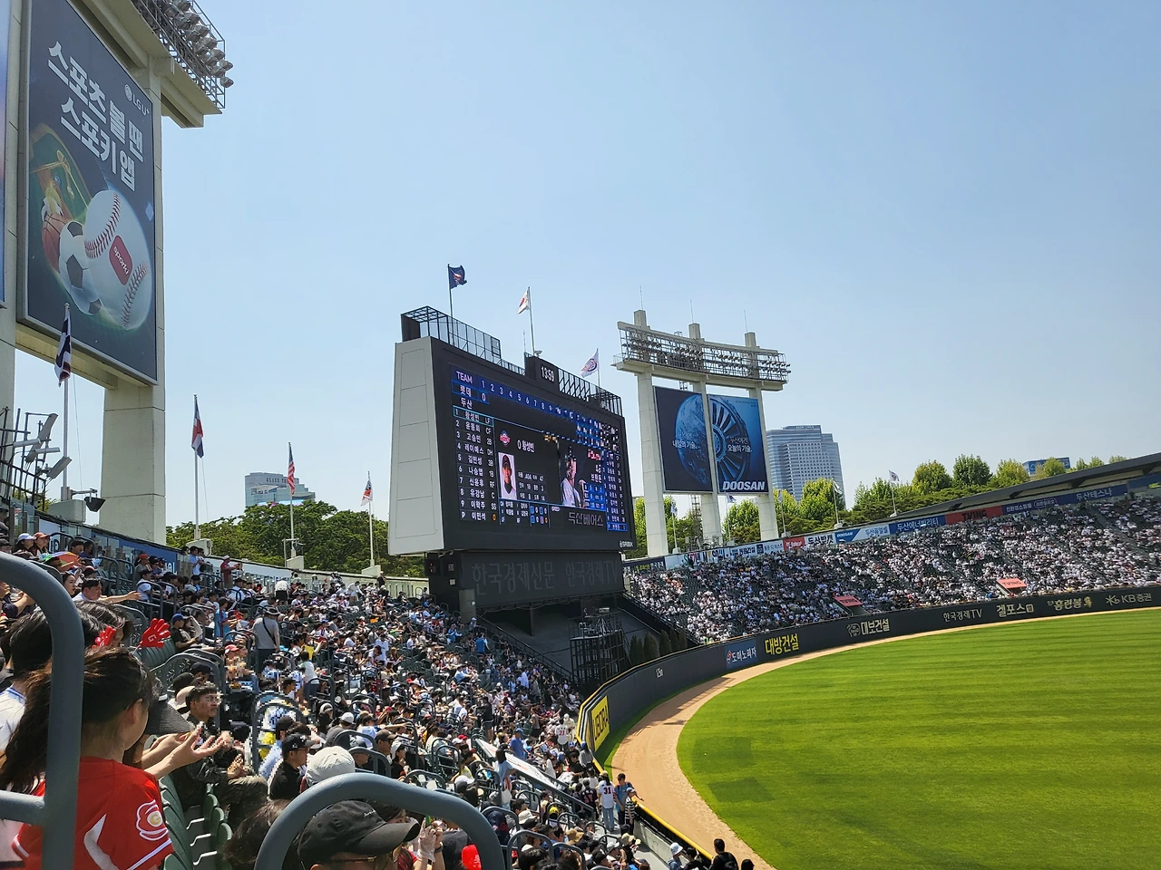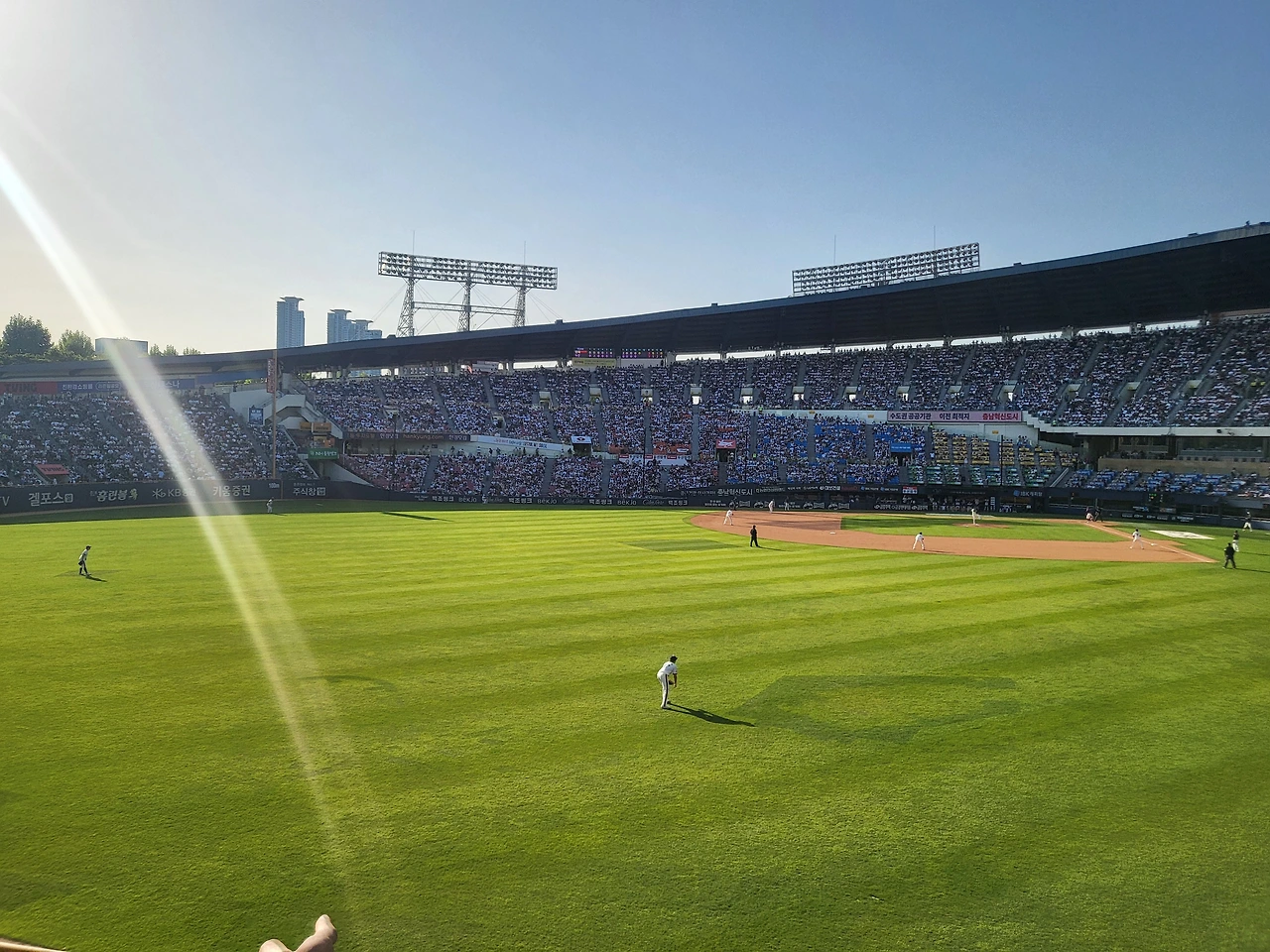 저녁 경기 예매를 놓친 우리는 일요일 오후 2시, 외야 3루 자리를 겨우 잡았다. 이날따라 봄볕은 여름볕으로 돌변했다. 애국가 부를 때 머리 꼭대기에 머물던 해는 경기 끝날 때까지 왼쪽 뺨 근처로 살짝 내려왔을 뿐 사라질 줄 몰랐다. 1년치 광합성을 하루에 다했다. 더웠지만 참았다. 마약김밥을 먹었고 닭강정과 만두도 차례차례 입에 넣었다. 그렇게 2시간을 보냈다.