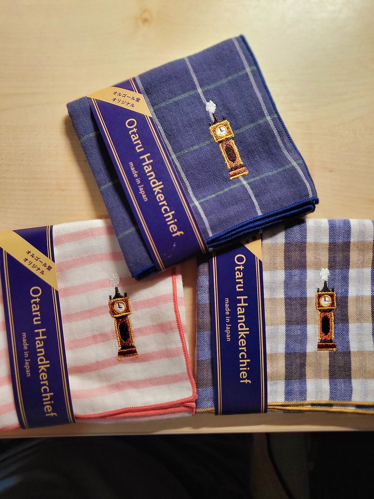 그런 내 발목을 잡은 게 있었으니 바로 손수건. 오르골당 증기시계가 곱게 수 놓였다. 단아하니 예쁘다. 770엔. 오르골값에 비하면 소소하다. 남색 바탕에 흰색과 초록색 줄이 얌전히 들어간 손수건은 남편 것, 분홍 줄무늬는 내 것. 가만히 있자, 남색과 갈색, 흰색 체크가 조화로운 손수건도 마음에 든다. 살까 말까, 손수건을 들었다 내려놓기를 여러 번. 오르골당에서 손수건에 마음을 뺏길 줄이야.