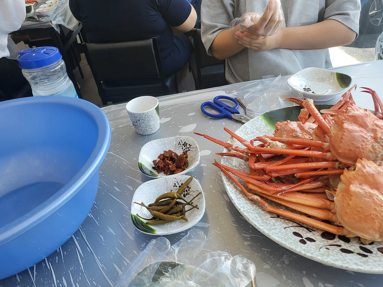 다음 날, 우린 대망의 홍게집을 찾아갑니다. 둘째를 실망시킬 순 없죠. 홍게집은 미리 전화해봐야 합니다. 그날 게를 얼마나 잡느냐, 배가 언제 들어오느냐에 따라 우리의 식사 여부도 결정됩니다. 조금 이따 와 보라는 애매한 답만 듣고 식당으로 향합니다. 배에서 갓 잡은 홍게를 먹으려면 이 정도는 감내해야죠. 예약에 성공! 이곳은 무한 리필입니다. 커다란 플라스틱 대야가 식탁 위에 턱 올라가 있습니다. 시간 맞춰 온 사람들이 비닐장갑에 손을 넣고 다 같이 사장님 설명을 듣습니다.