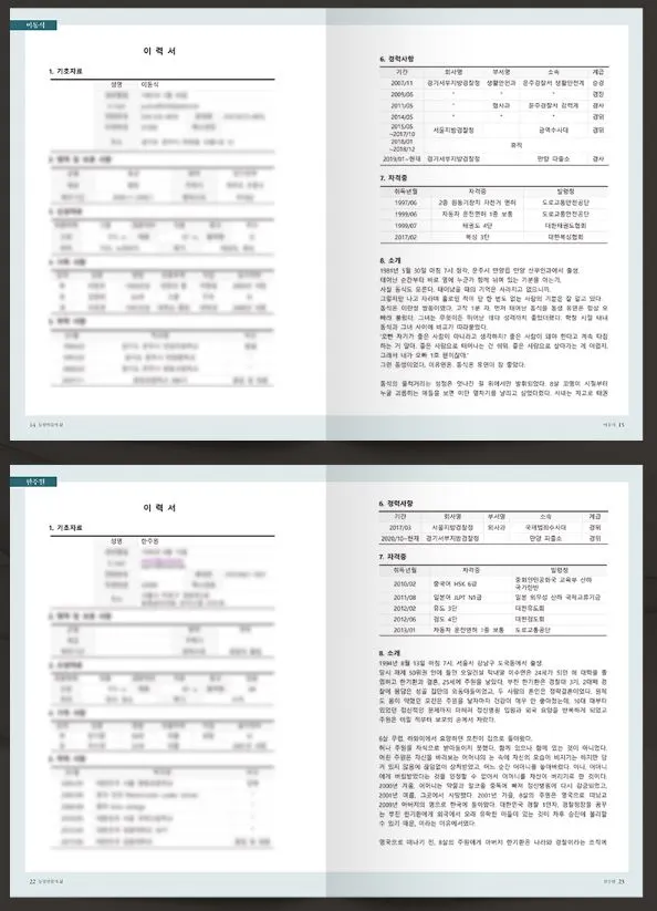작가의 시크릿 노트는 등장인물 11명의 삶을 펼쳐놓는 것부터 시작한다. 드라마가 보여주지 않은 등장인물의 전사가 이력서 파일 형식으로 고스란히 적혀있었다. 이력서 구성 항목을 뻬곡히 채워 넣었는데 생년월일, 이메일 주소, 전화번호, 휴대폰 번호, 주소, 학력과 키, 몸무게, 혈액형, 종교, 취미와 특기, 가족의 연령과 가족들의 최종학력과 직업, 동거여부가 적혀있다. 그들이 졸업한 초등학교, 중학교, 고등학교, 대학교 이름과 졸업 연도, 직업별 경력사항과 자격증까지 적었다. 산부인과에서 출생한 시점부터 드라마가 끝나는 시점까지의 생애와 성장배경, 사건 발생 당시의 감정과 각 인물들에게 품었던 생각까지 쓰여있다. 사건의 구성과 각 인물의 전사를 배우가 이해해야 온전히 그 사람으로 연기할 수 있기 때문에 작가는 이렇게 쓴 각 캐릭터의 이력서를 배우와 스텝에게 공유했다. 책에는 이력서에 사진이 포함되어있지 않았지만 김수진 작가는 사진까지 다 찾아서 이력서 파일로 만들었다고 한다. 이 정도까지 해야 저런 작품이 만들어지는 것일까. 책의 첫 부분부터 자세를 고쳐 앉아 읽어나가기 시작했다.