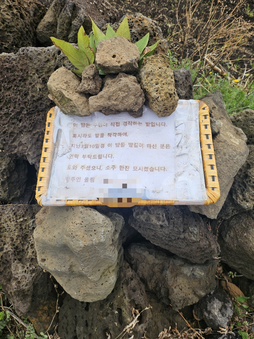 미안한 마음을 담아 밭주인이 실수로 밭은 간 사람에게 소주 한 잔 올린단다.