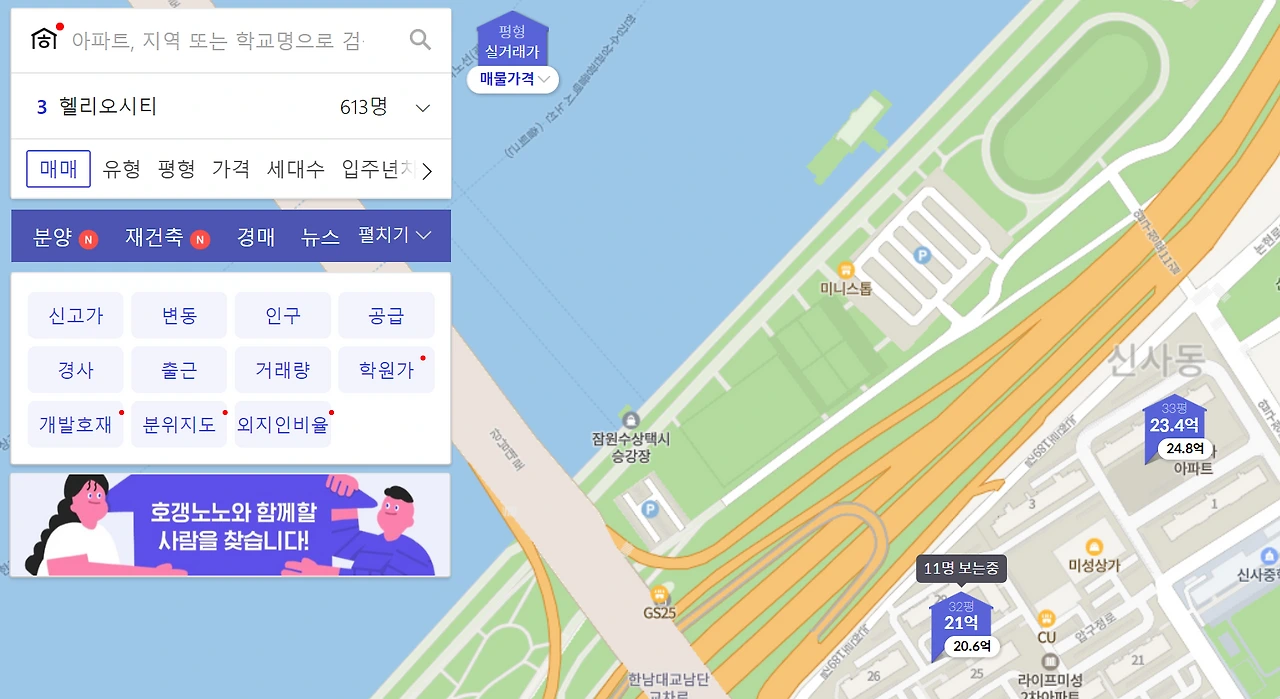 인상적인 부분은 오히려 직방에 인수된 후 호갱노노 서비스의 차별화가 드라마틱하게 일어났다는 점입니다. 실거래가에 대한 정확한 정보 외 큰 차별점이 여전히 보이지 않았던 호갱노노가 지금은 '신고가', '가격 변동', '인구', '경사/고도', '학원가', '개발호재', '외지인 비율'까지 다양한 분석 데이터를 기반으로 흥미로운 데이터 시각화를 제공하고 있기 때문입니다. 가끔 TMI가 아닐까 싶을 정도로 다양한 데이터 시각화를 보여주지만 서비스가 지향하는 방향성이 직방과는 또 다르다는 점이 향후의 호갱노노를 기대하게 만듭니다.
