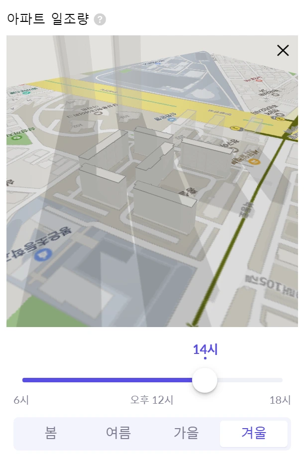 최근 지원하기 시작한 '일조량' 확인 기능은 조망권이나 일조권의 변수가 있는 단지에 주로 제공되는 것 같아 보입니다. 2D를 3D로 구현하는 오픈소스를 접목한 기능으로 보이는데, 혁신적인 기능으로 평가 받을 지에 대해서는 조금 시간이 필요할 것 같습니다. 충분히 흥미를 유발하지만, 주택 구입 의사 결정을 하는 데 있어 핵심적인 기능들을 집중적으로 고도화하는 것은 어떨까 싶기도 합니다.