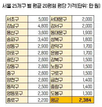 이 자료만 놓고 쉽게 파악할 수 있는 부분은 강남구를 시작으로 종로구까지는 사람들이 선호하는 지역일 가능성이 높다는 것입니다. 이 자료는 전 세대를 놓고 파악된 자료인데, 내가 소형 평수를 원하는 사람이라면 20평형대 자료만 놓고 다시 재차 분석해 볼 수 있습니다. 아래와 같이 말이죠.