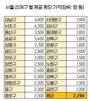 이 자료를 통해 실거주자의 입장에서 어느 동네가 인기 동네인지는 파악할 수 있습니다. 이는 투자자의 입장과도 맞물리는데, 이 자료에서 나타난 순위는 어쨌든 시세 순위가 반영된 자료로, 해당 단지들이 수요를 대신하는 자료이며, 입지를 말하는 자료입니다. 자료에 의하면, 서울 25개구의 지역구별 평당 평균 가격은 2,264만 원입니다. 평균을 놓고 왼쪽은 평균 이상, 오른쪽은 평균 이하입니다. 이유가 다양하겠지만, 서대문구부터 금천구는 평당 가격을 놓고 봤을 때, 저평가 지역입니다.