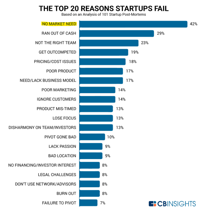 Product-Market Fit, 흔히 제품과 시장의 적합성이라고 풀리는 PMF는 사업의 성패를 좌우합니다. PMF가 얼마나 중요한지는 아래 CB Insight의 자료만 봐도 금방 이해가 갈 텐데요, 실패하는 이유 첫 번째가 '시장이 원하지 않아서(No market need)'입니다.
