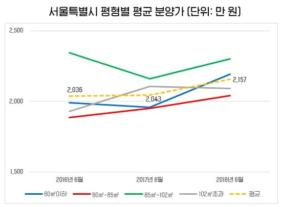 재개발 이슈로 용광로같이 끓었다가, 최근에는 다소 어려움이 점쳐진 부산광역시입니다. 부산도 경기도와 같이 전 평형대가 우상향이지만 그 모습이 다소 다릅니다. 85㎡-102㎡ 평형대는 2017년부터 가파르게 분양가가 상승하고 있으며, 60㎡-85㎡ 평형대는 상승하고 있으나 그 상승세는 약해졌습니다. 이렇다 할 정확한 원인이 밝혀진 바는 없으나, 부산에서 오래 거주한 은퇴 세대가 큰 평수의 주택을 처분하고 보다 작은 평수의 아파트 수요가 증가하고 있다는 점은 참고할만합니다. (부산에서의 큰 평수 개념은 서울과 또 다릅니다.)