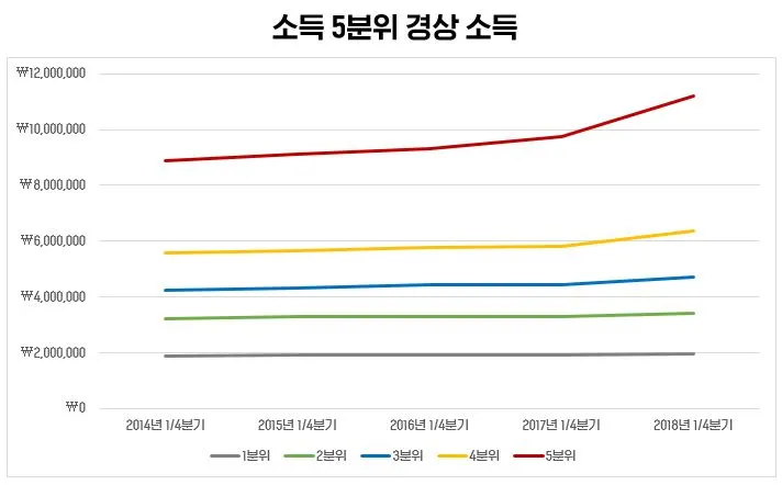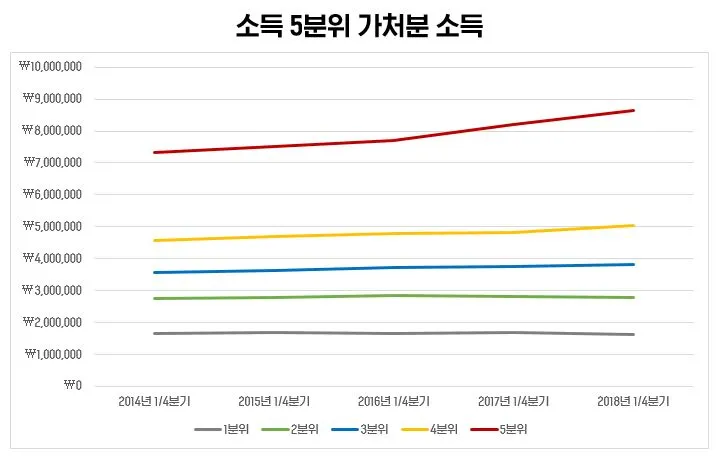 분위별 가처분 소득을 보면 우울하기까지 하다. 그렇지 않아도 근로 소득의 증가도 힘겨운데, 1, 2분위 소득층은 가처분 소득조차 감소 추세다. 3분위와 4분위는 완만한 오름폭을 보여주고 있지만, 실제적으로 유의미한 오름폭은 아니다. 다른 얘기지만, 2018년 미국이 공식적인 금리 인상기를 선언했음에도 우리나라 금리를 올리는 데 부담스러운 이유다. 금리를 인상하려면 내수 경기가 살아났다는 증거가 있어야 하는데, 그렇지 않은 것이다.