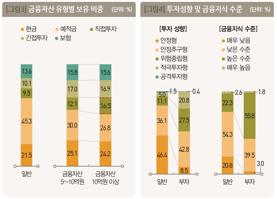 부동산을 언급하기 앞서, 부자들이 기본적으로 투자 관점에서 어떤 태도를 취하는지 짚어보겠습니다. 아무래도 '가처분 투자 금액'이 높아, 다양한 투자를 진행하고 일반인보다 공격적일 것으로 생각하기 쉬운데, 위 그래프를 보니 일반인 대비 실제로 그렇긴 합니다. 본인이 금융지식에도 이해도가 높다고 생각하며, 이를 바탕으로 실제 투자에 있어서도 '그런 편'입니다. 특이점은 그렇다고 해서 '공격 투자형'은 아니라는 점이네요. 일반인 대비 '적극성이 있는 투자'와 '안정추구형 투자'가 골고루 분포돼 있습니다. 확실한 것은 일반인 대비 이율이 낮은 '안전빵' 투자는 지양하고 있다는 점입니다.