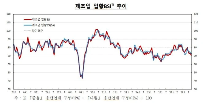 기업의 체감 경기를 나타내는 기업경기실사지수(BSI) 또한 22개월 만에 가장 낮은 수준인 73포인트를 기록했습니다. 이 지수 또한 100 미만이면 경기를 비관적으로 보는 기업이 많음을 의미합니다. 미-중 무역분쟁과 내수부진이 겹치며 2019년에도 회복이 쉽지 않을 것으로 보입니다.