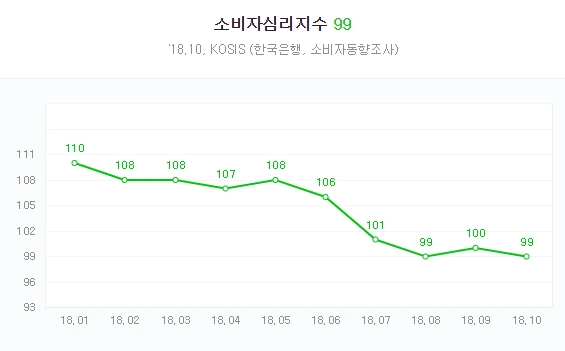 정체된 경제 성장률과 가처분 소득 증가는 소비자심리지수에도 영향을 끼칩니다. 경제 성장률이 수출 실적에 큰 영향을 받기도 하지만, 내수시장 활성화 또한 큰 영향을 줍니다. 소비자심리지수는 기준값 100보다 작으면 비관적이라는 의미를 갖는데, 턱걸이를 한 수치긴 하지만 100 아래로 떨어진 상태입니다. 2017년 하반기 소비자심리지수가 100을 웃돌았던 상황을 볼 때, 올해 소비자심리지수는 지속적으로 하락하고 있습니다. 소비가 몰리는 연말 소비자심리지수에서 반등하는 모습을 보일지 모르겠지만, 최근 대출 규제와 실질 금리 인상 등의 여파로 소비 심리가 되살아나기 어려운 환경입니다. 더군다나 금리 인상이 변동 금리 대출을 받은 대출자의 이자 부담까지 가중시킬 것으로 생각하면 금리 인상 카드는 쉽지 않습니다.