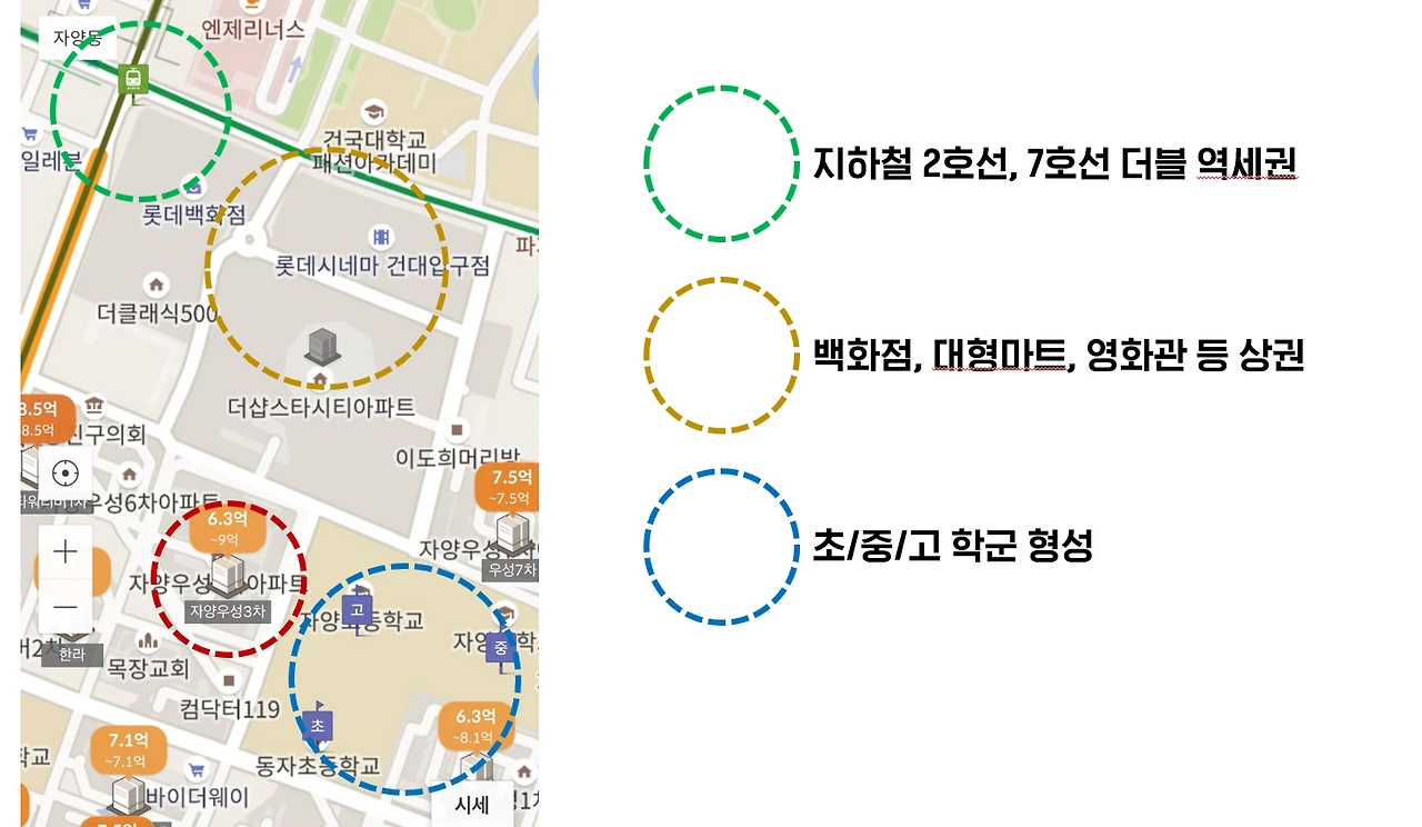 위에 언급한 자양 우성 3차 아파트의 경우, 10분 내 건대입구 역을 이용할 수 있고 백화점과 대형마트(이마트)가 인접해 있습니다. 게다가 A 씨가 잠재적으로 필요로 할 학군도 매우 가까이 형성돼 있습니다. 가격뿐만 아니라, 여러 요소들이 38세인 A 씨에게 좋은 선택지가 될 수도 있겠네요.