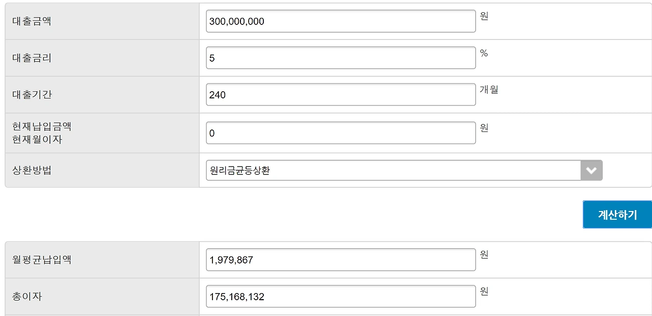 실거주 목적 매수의 핵심은 일관성 있는 관점입니다. 일단 총자산을 정의합니다. 예로 든 A 씨의 순자산은 4억 원인데요, 2018년 11월 KB부동산 리브온 기준 서울 아파트 평균 매매가가 8억 원입니다. 어느 정도 만족할만한 지역으로 진입하려면 대출이 좀 필요하겠네요. 대출 계산기를 통해 본인의 소득 대비 상환할 수 있는 수준을 점쳐봅니다.