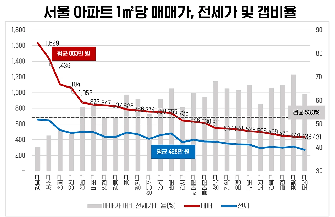 위 그래프는 서울 아파트의 ㎡당 매매가와 전세가를 나타내고 있는데요, 총 예정 자산이 7억 원인 A 씨가 25평 형을 매수할 수 있는 지역은 산술적으로 양천구부터 가능해 보입니다. 물론 지역에 비해 저평가된 단지도 있고, 다른 변수도 있지만 이렇게 매수 가능한 대표 지역이 어딘지를 먼저 파악하는 것이 선택에 효율적입니다.