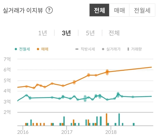 대부분 매수자의 우려는, '향후 내 집값이 하락하면 어쩌지?'라는 점입니다. 이는 해당 단지의 거래량과 전세가 흐름 2~3년 치를 확인하면 가늠해볼 수 있습니다.