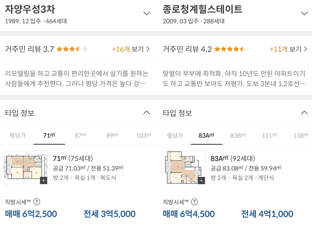 A 씨가 고려할 수 있는 준대장, 준준대장급 단지 예시로 광진구 자양 우성아파트 3차와 종로 청계 힐스테이트를 가져왔습니다. 단지를 선택할 때는, 해당 지역에서 인기가 많은 단지를 고려 대상으로 생각해야 합니다. 일반적으로 인기 단지인 이유는 역세권 등 교통 외에도 학군, 상권 등 여러 요소들이 집중됐을 가능성이 높기 때문입니다.