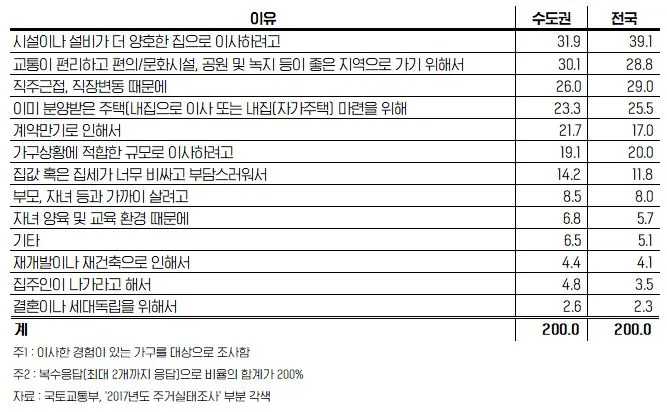 뜬금없지만, 나는 이런 식으로 자료를 한 번 더 분석하길 좋아한다. 오늘은 사람들이 '현재 주택으로 이사한 이유'를 통해 내재된 '수요' 요소를 알아보려 한다. 이 표를 보기 쉽게 바꾸면 아래와 같다.