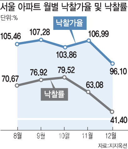 최근 경매 낙찰가율까지 감소하고 있는데, 부동산 시장 사이클 중 침체기나 조정기로 해석할 수 있습니다. 바꿔 말하면, 경매 시장이 활발해지면 경매 낙찰가율이 꾸준히 상승하게 되고 부동산 회복기로 진입하는 신호로 이해할 수 있습니다. 일반 매매 시장도 마찬가지지만, 부동산 시장이 상승 전환으로 평가받기 시작하면 경매 시장도 하루빨리 토지나 건물을 매입하려는 수요자들로 인해 북적거리기 마련입니다. 참고로, 낙찰가율은 특정 부동산의 감정 평가액을 100으로 뒀을 때, 실제로 경매를 통해 팔린 금액 비율을 의미합니다. 서울 아파트는 부동산 상승기에 시세 차익이 기대되는 투자처로 인식돼 꽤나 오랜 기간 100을 넘고 있었는데 2018년 12월 그 선이 무너졌습니다.