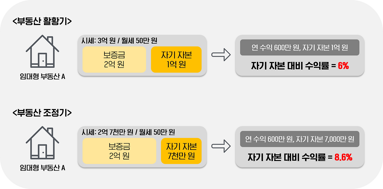 조정기나 침체기에 수익형 부동산에 대한 관심이 증가하는 이유는 이론적으로 실제 투자하는 자기 자본 대비 수익률이 증가할 수 있기 때문입니다. 매매를 통한 시세 차익을 기대하기 어려운 환경에서 임대를 통해 높은 수익률을 달성할 수 있는 기회가 열리기 때문입니다.