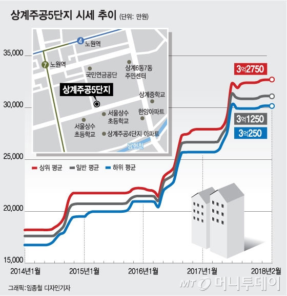 강남구 일원동의 수서1단지(1992년 준공)는 2018년 11월에 입주를 시작한 래미안 루체하임 등의 분양가와 시세에 민감하게 반응한 단지입니다. 낡은 아파트지만 소형 평수가 다수 분포했으며 5년 내 재건축 모멘텀이 생기는 수서1단지는 상대적으로 매매가가 낮아 신축 단지 매매가를 따라잡는 현상이 벌어졌습니다. 2018년 기준 무려 53% 이상의 매매가 상승률이 있었습니다. 노원구 상계동 주공 5단지(1987년 준공)는 조금 다른 이유인데요, 노원역 더블 역세권에 상권, 학군까지 누릴 수 있는 노원구 최고 단지 중 하나인 주공5단지는 2억 원대 매수가 가능한 단지였습니다. 용적률도 낮아 사업성이 좋은 대표적인 재건축 예정 단지였습니다. 10개 단지 중 가장 낮은 상승률을 보여줬는데요, 그래도 45%의 상승률을 보여줬습니다.