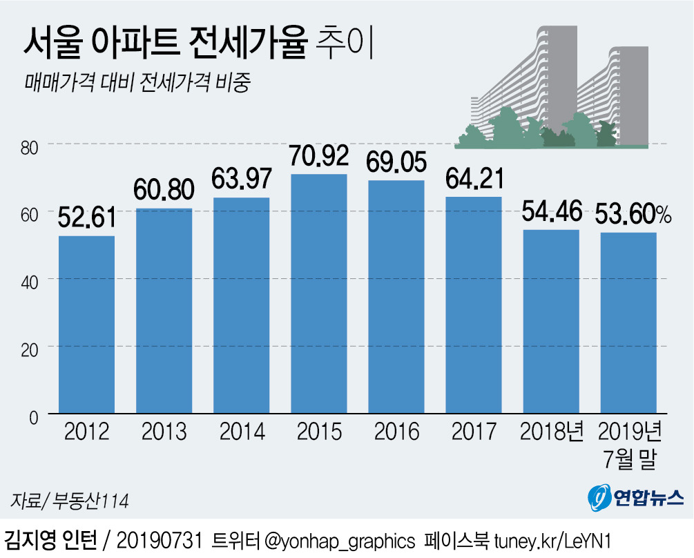 서울 아파트 전세가율(매매가격 대비 전세가격 비율)이 7년 전 수준으로 회귀했다. 31일 부동산114 조사에 따르면 7월 말 현재 서울 아파트 평균 전세가율은 53.6%를 기록했다. 이는 7년 전인 2012년 평균 52.61%와 비슷한 수준으로 2015년 평균 70.92%, 2016년 평균 69.05%에 비해 크게 낮아진 것이다.