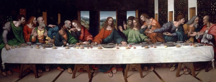 이 그림을 한 번 보시죠. 역시 레오나르도의 최후의 만찬입니다만 어딘가 좀 다르죠? 우선 인물들의 생김새나, 표정, 움직임의 세련됨이 좀 떨어져 보입니다. 하지만 색상은 더 화려하고 경계선은 훨씬 뚜렷합니다. 그렇습니다. 이것은 레오나르도가 그린 것이 아닙니다. 조반니 피에트로 리졸리가 레오나르도가 그린 최후의 만찬을 1520년 경에 유화로 모사한 작품입니다. 그는 잠피에트리노라고도 불리는데 최후의 만찬이 제작되는 동안 레오나르도의 제자이었기 때문에 아마도 그와 함께 작업용 비계에 올라 함께 그림을 그렸을 가능성이 높습니다. 만약 직접 그림 제작에 관여하지 않았더라도 레오나르도의 제자로서 그의 의중을 잘 파악할 수 있었기 때문에 그에 의해 그려진 이 모사작은 지금까지 제작된 어떠한 모사작들보다도 원작을 가장 정확히 보여주는 작품일 것이라 여겨집니다.