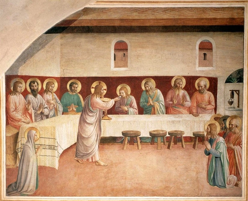 또한 요한 복음서에 나온대로 유월절 만찬시에 "... 제자 가운데 한 사람이 예수님 등에 기대어 앉아 있었는데 그는 예수님께서 가장 사랑하시는 제자였다..."라고 나와있듯이 요한은 원래 예수의 옆에 앉아 있었습니다. 그렇다면 댄 브라운이 막달라 마리아라고 주장했던 인물은 역시 사도 요한이었다는 말이 됩니다. 최후의 만찬의 중요한 참석자인, 그리고 원래가 예수의 옆자리를 차지하고 있던 요한을 마리아로 둔갑시키면서까지 그녀를 몰래 이 자리에 출연시켜야 할 이유가 있었을까요? 마리아는 최후의 만찬에 등장하면 안되는 것이었을까요? 그렇지는 않은 것 같습니다. 프라 안젤리코가 그린 '제자들의 성찬'이란 그림을 보실까요? 예수가 제자들을 위해 거행하고 있는 성찬식의 왼쪽 아래 구석에 무릎을 꿇고 앉아있는 막달라 마리아가 보입니다. 정말로 레오나르도가 그녀를 그림에 등장시킬 의도가 있었다면 이미 선례가 있듯 이러한 방식으로 함께 그려 넣을 수도 있었다는 말입니다.