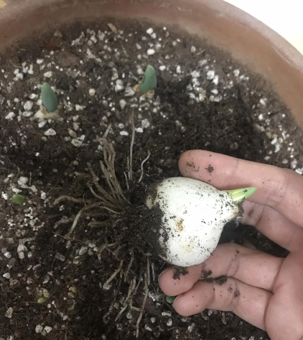 구근을 살짝 건드려본다. 아래에 뿌리가 났다면, 어지간한 힘으로 건드려도 전혀 움직이지 않을 거다. 근데 얘는 약간 힘줘서 밀었는데 술렁 들려 일어난다.