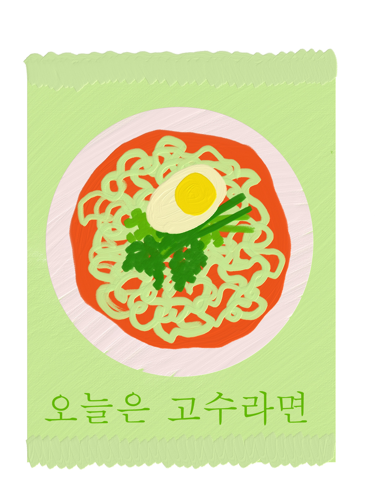 편의점에 진열된 여러 라면을 상상해 보세요.