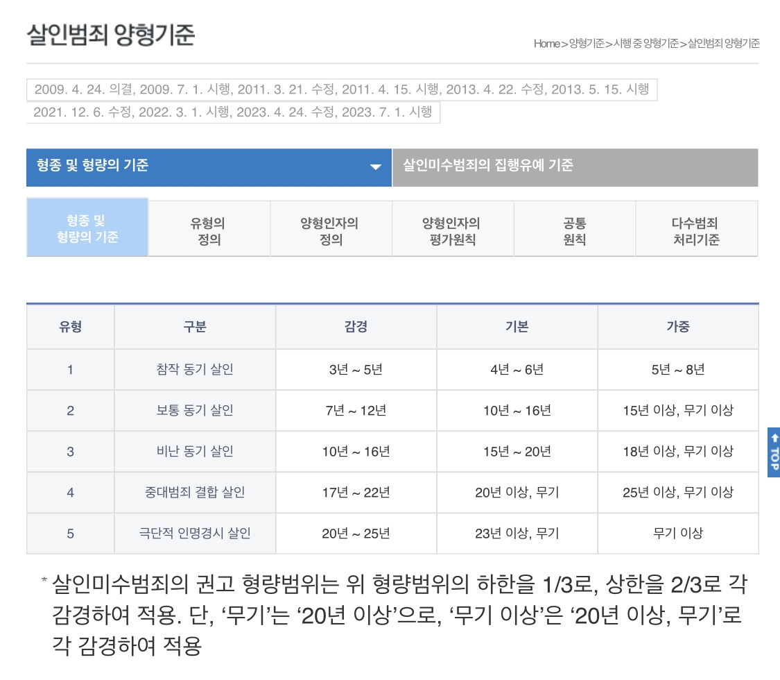 대법원에서 중요한 범죄의 양형기준을 미리 정해두고 있습니다. 형법 등 법률에는 죄명별로 법정형이 정해져 있지요. 하지만 법정형은 범위가 넓고 최소한 혹은 최대한의 형만을 규정하고 있어요.