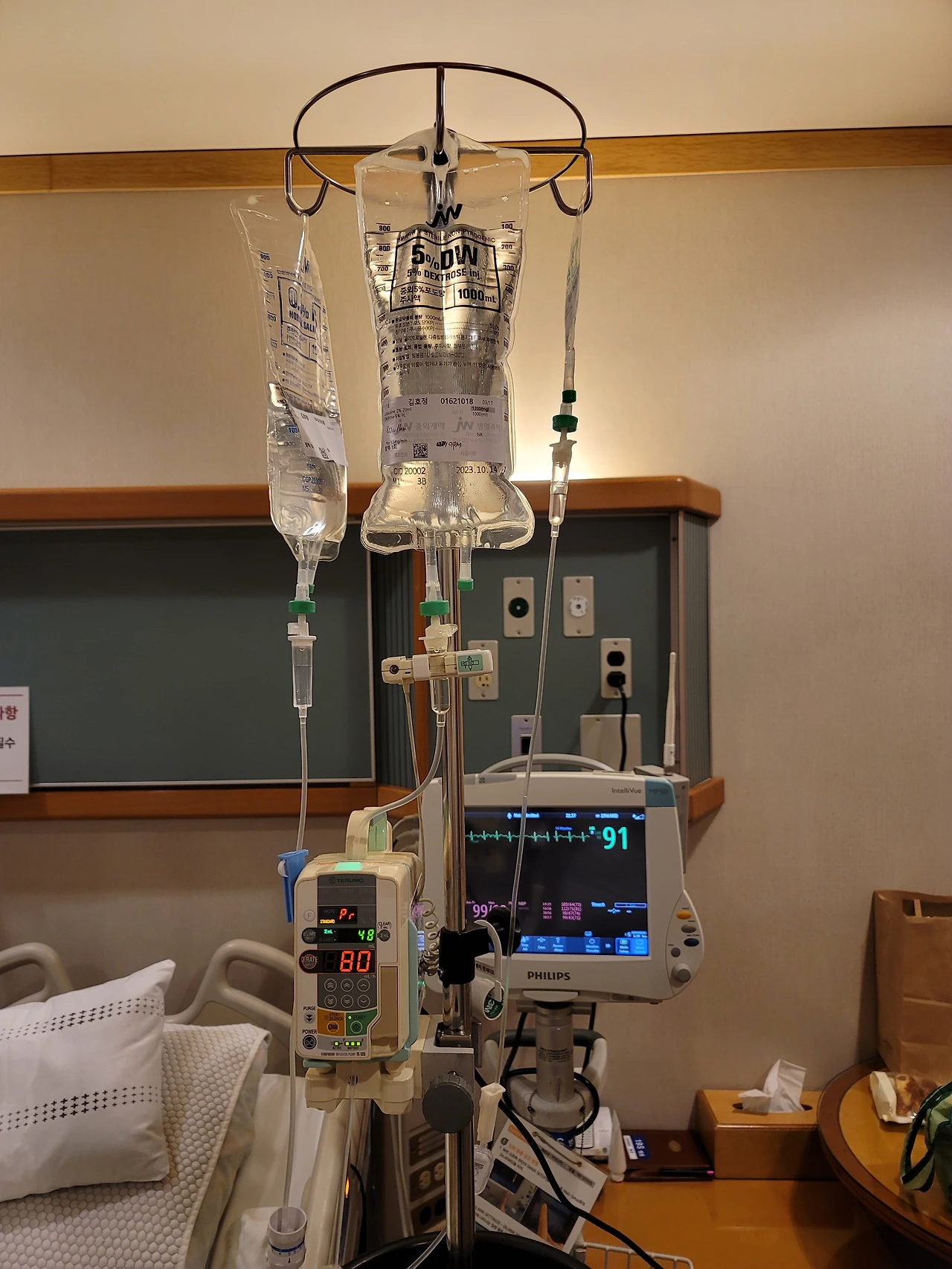 몸에 빼곡하게 쌓여있던 약을 씻어내야 하는 생리 식염수와 리도카인 희석액이 들어가야 하는 라인은 반드시 잡아야 했고 하루에도 몇 번씩 혈액 검사를 해야 하는 라인도 따로 잡아야 했으며, 두통이 심해질 때 들어가는 약물인 마그네슘을 투여해야 하는 라인이 한 군데가 더 필요했다.