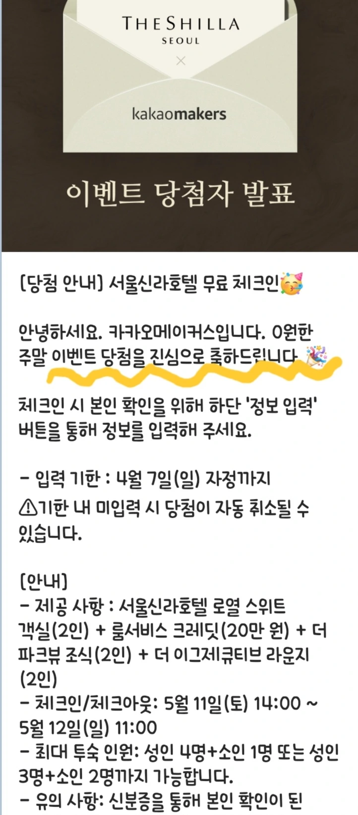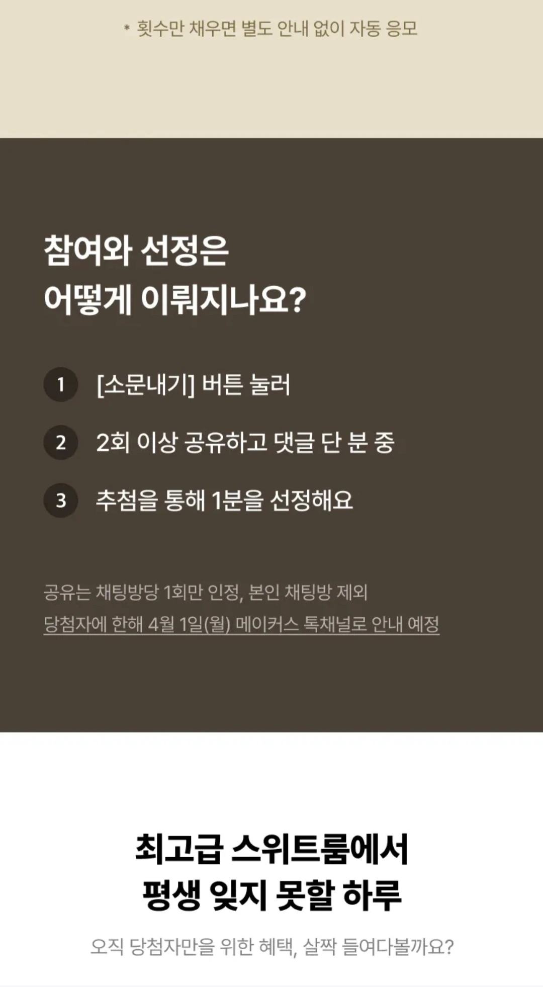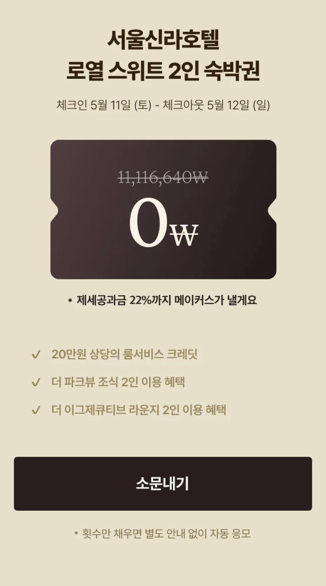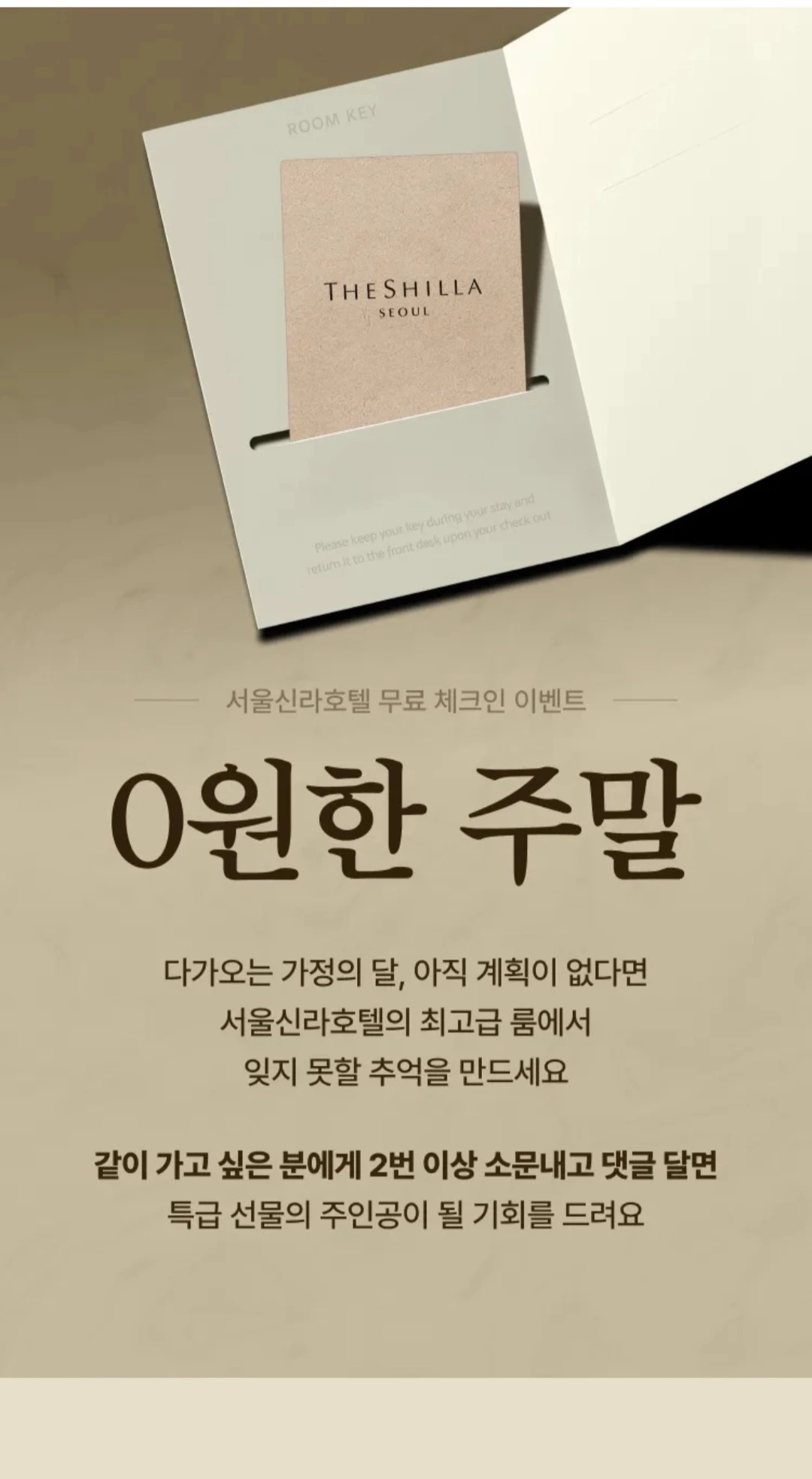 다가오는 5월 가정의 달을 맞아 1박에 1,000만 원이나 하는 로열 스위트룸을 단 한 사람의 당첨자에게 제공하겠다는 이벤트였어요. 게다가 제세 공과금까지 면제여서 실질적인 금액은 11,116,000원이고 당첨된 사람은 1원도 내지 않고 호캉스를 즐길 수 있다는 겁니다. 거기에 2인 식사권과 조식권, 라운지 이용권까지 포함해서요.