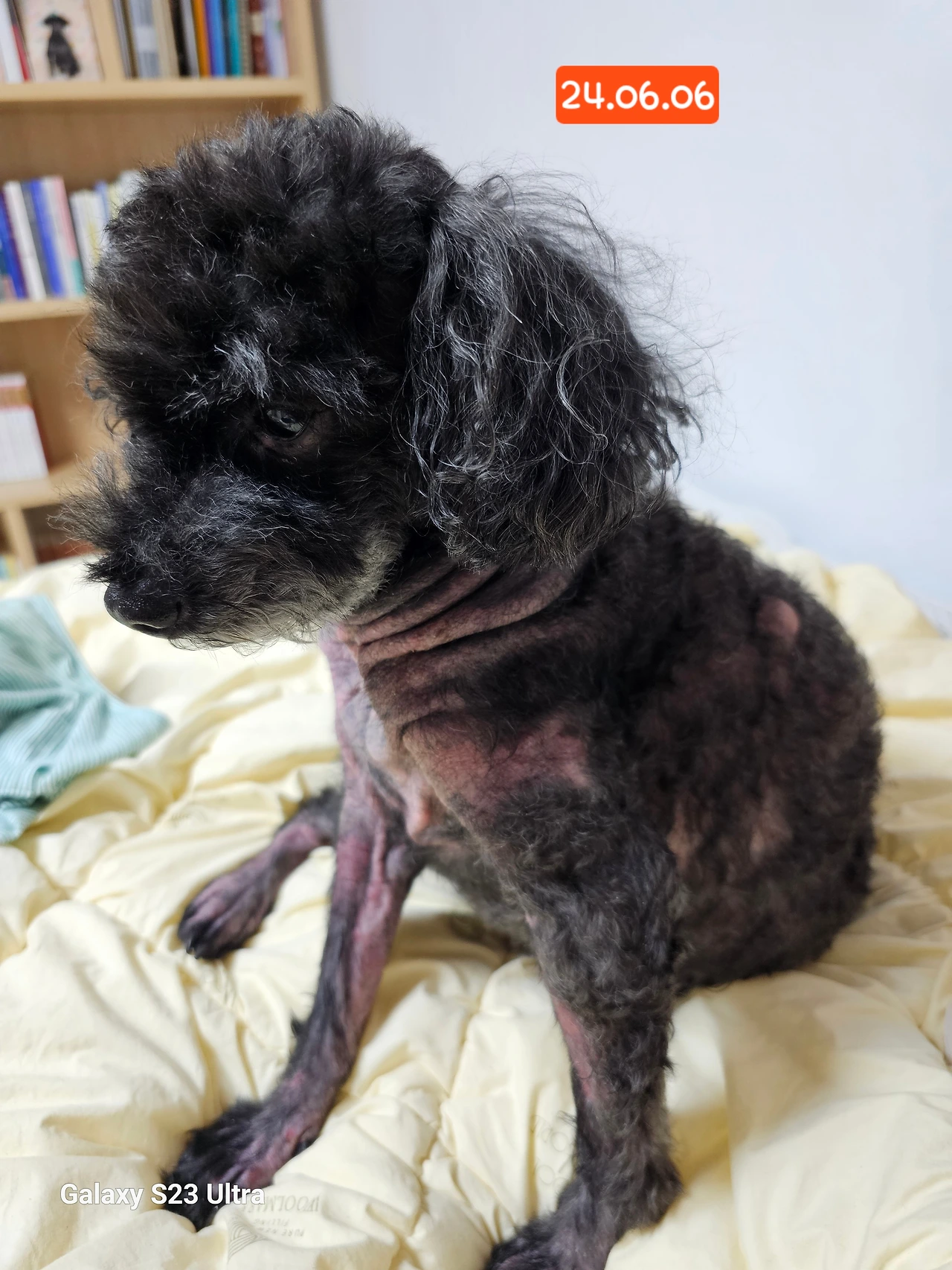 나이가 들어가며 (콩이가 올해 13살이에요) 조금씩 아픈 곳이 있긴 했지만 지난 열 달간 급격한 아토피 증세와 알레르기 반응으로 온몸의 털이 빠지고 각질이 두껍게 앉았다 탈락하면서 단 한순간도 긁지 않고는 견디지 못하게 됐어요.