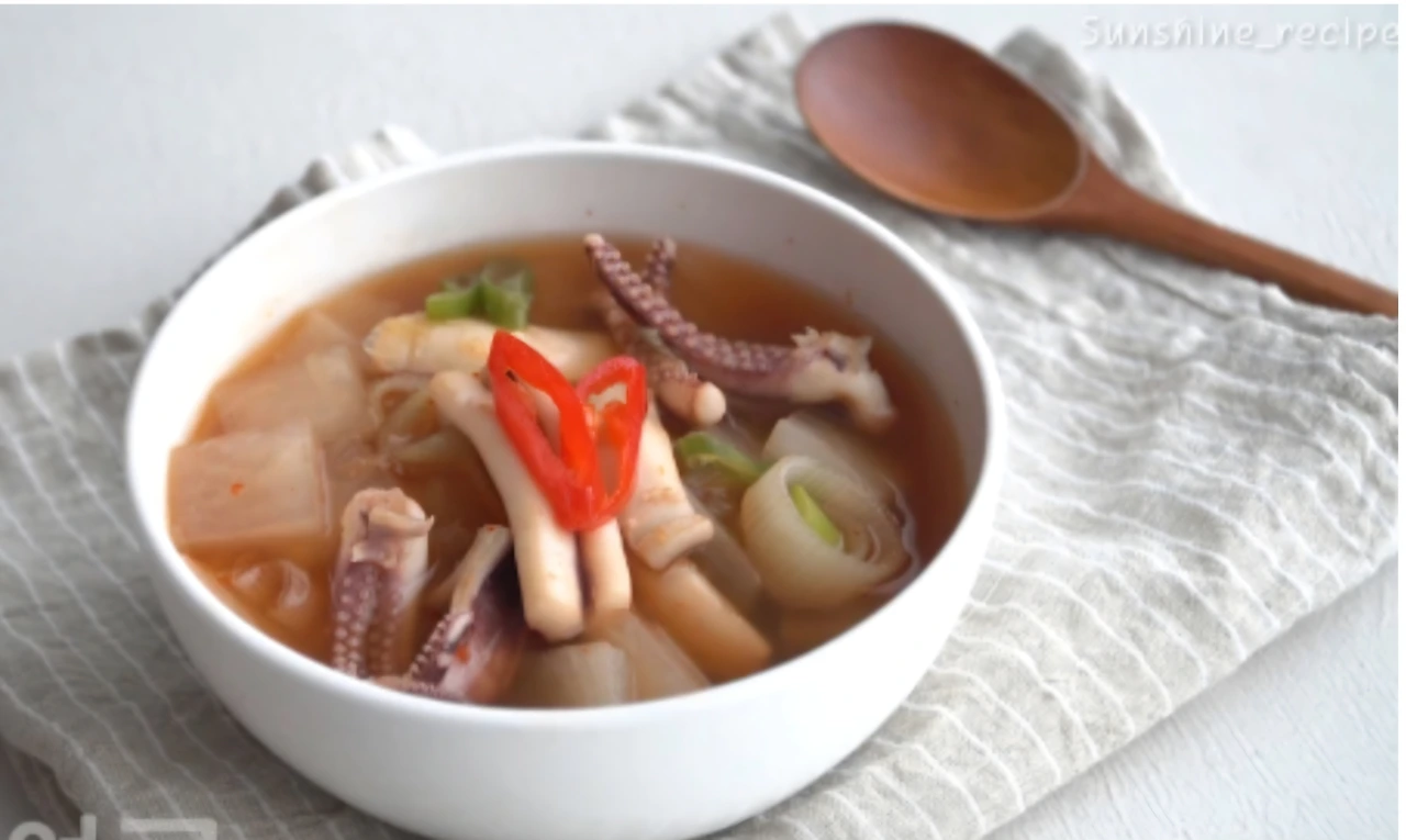 무가 한소끔 끓어오르면 고춧가루와 마늘, 양파 애호박 등을 넣고 팔팔 끓이다가 채소가 어느 정도 익으면 오징어를 넣고 오징어가 다 잠기지 않을 만큼 채수를 붓고 오징어가 질겨지지 않도록 후루룩 끓여낸다.