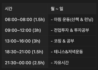 이렇게 나누고 이에 따라서 일주일을 재정립하였다. 주 40시간 기준으로 주7일 하루에 6시간은 경제적 자립을 위해서 투자와 코칭에 시간을 할애하고자 하였다. 오전 3시간, 오후 3시간은 이 일을 위해 시간을 쓰고자 하였다. 그리고 아침 1시간 30분, 저녁 2시간은 개인적인 운동과 테니스를 치는 시간으로 설정해 두었다. 그리고 주말은 2일로 따지면 8시간씩 16시간이니, 하루에 2시간 30분씩은 온전히 아무것도 하지 않아도 되는 시간으로 설정하고, 밤9시 30분부터 12시까지는 정말 빈둥되는 시간으로 설정하였다.