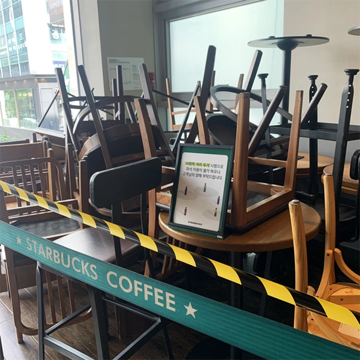 ‘사회적거리두기’ 정책이 점차 강화되던 초기에 고속버스터미널에 갈 일이 있었는데 모든 카페 의자들이 이용을 못하게 한쪽으로 치워져있었고 ‘공간’에 대해 꽤 진심으로 사업을 하고 있는 스타벅스마저 마치 인테리어를 하다 만듯 가구들을 한쪽에 쌓아놓고 서비스를 제공하고 있었다. 그 모습이 너무 생경했고 사실 충격적이기도 했다. 그런 풍경이 그날 하루만이 아니라 거의 2년이나 지속되었다.