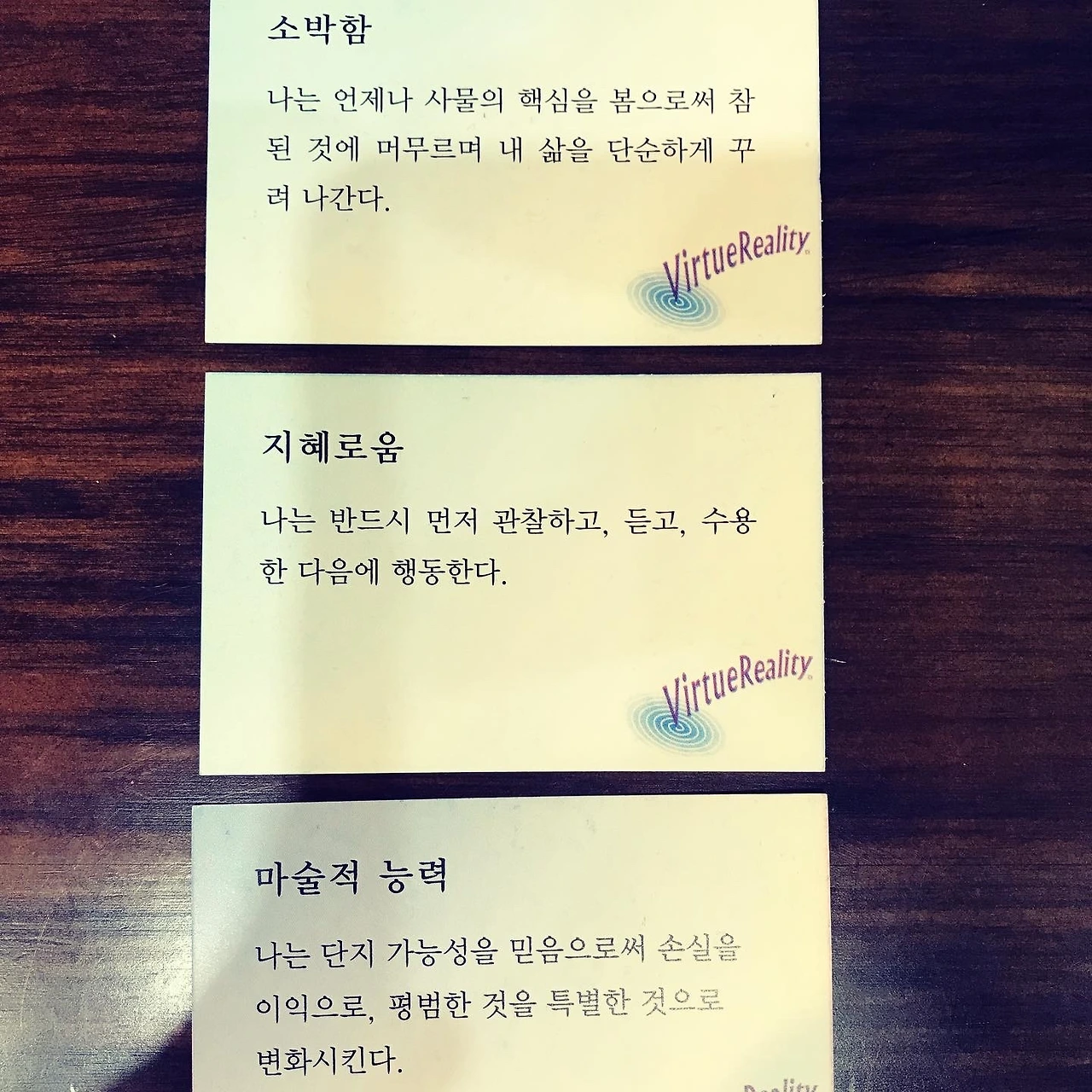 어제 모임에 오신 분들 중에 ‘미덕 카드’를 준비해 온 분이 계셔서 시키는대로 세 장을 뽑았는데 소박함, 지혜로움, 마술적 능력이 나왔어요. 제가 가진 미덕이라는데 내년에도 잃지않고 유지했으면 좋겠습니다.