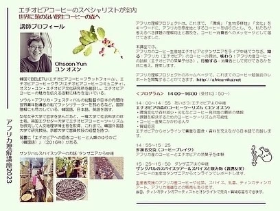 일본에서 아프리카 인식개선 활동과 문화예술 소개활동를 왕성하게 하고 있는 비영리단체인 ‘아프리카 이해 프로젝트(Africa Rikai Project, 대표 Kurumi Shiratori)’에서 주관하는 행사로 타이틀이 아주 마음에 듭니다. “닥터 윤(Dr. Yun)과 함께 하는 에티오피아 야생커피(Wild forest coffee) 투어리즘”. 일본에서 에티오피아와 함께 키워드로 등장하는 한국인 윤박사는 아직까지 저 한 명이라서 강연 타이틀을 이렇게 만든 것 같습니다.
